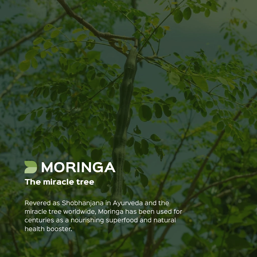 Moringa (commonly known as drum stick, Shigru/ Sahinjan, botanical name – Moringa oleifera) is a plant that is native to the sub-Himalayan areas of India, Pakistan, Bangladesh, and Afghanistan. It is also grown in the tropics. The leaves, bark, flowers, fruit, seeds, and root are used to make medicine. Ayurveda mentions that it is useful in pacifying Vitiated kapha/vata, promotes adequate blood flow to heart muscles & low blood lipid levels. Ayurveda says, by virtue of its properties of Tikshna & Ushna it supports healthy digestion and non accumulation of waste materials, toxins & fat cells. As mentioned in ancient texts Moringa leaves have special effects on relieving pain by virtue of its Vata reducing properties and anti-inflammation action. Moringa Leaf supports impressive range of medicinal uses with high nutritional value (rich in essential amino acids, vitamins, potassium, calcium, iron etc) and promotes overall health & vitality due to its anti-oxidants, alkalizing properties. Moringa leaves are a good vegetarian source of Vitamins, phyto nutrients and dietary fibre which supports strength & energy. The Scientific results indicate that Moringa has high Nutritional value with multi-vitamins, phyto nutrients, supports low blood triglycerides & cholesterol levels beneficial for Heart, Blood circulation & healthy weight management.