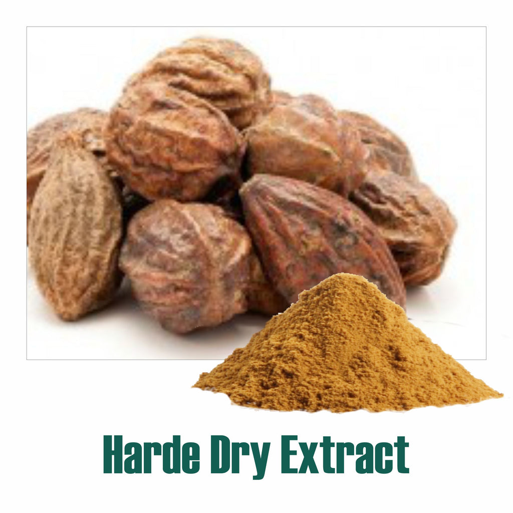 Harde extract, which is in rich in Tanins, basically helps to remove toxins & undigested materials from body as mild laxative & helps digestion. Harde extract supports general health gain, well being of eyes, brain, throat, intestine, skin, liver, spleen & urinary tract. Haritaki extract helps to promote anti-oxidant properties, prevention of tissue damage & to increase energy levels. The Tanins in Harde extract is supposed to be beneficial for healing mouth ulcers, gingivitis and controlling bleeding from the gums.