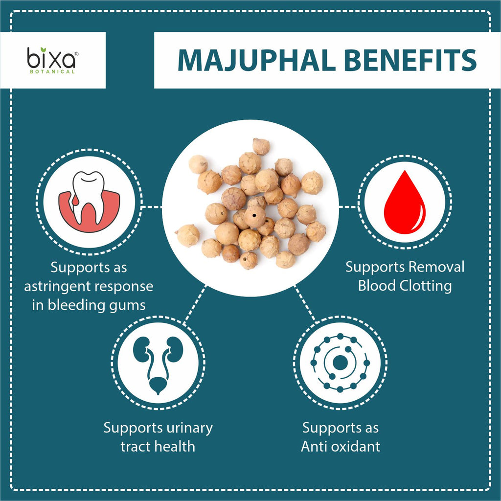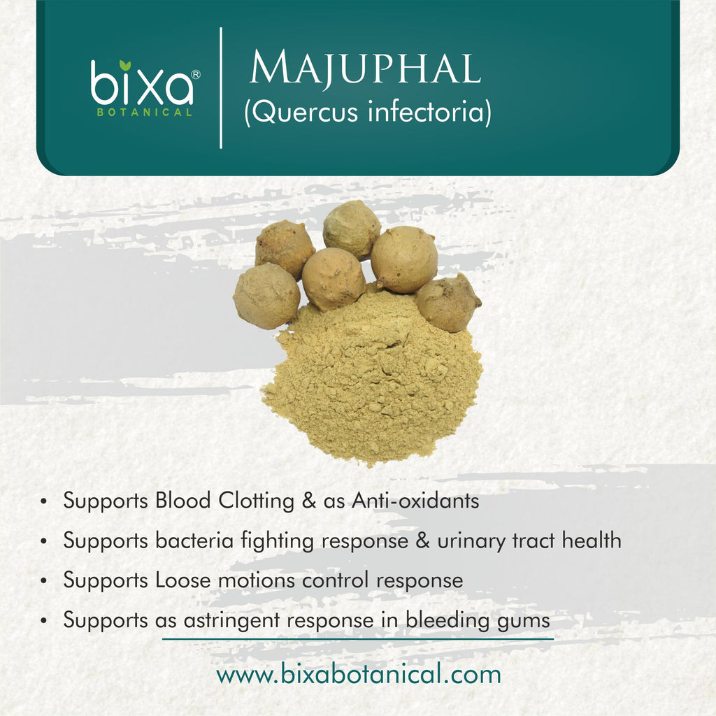 As per Ayurveda Majuphal is astringent, dry and light in nature; cool in potency and helps to pacify pitta & kapha. In Ayurveda it has been successfully used for controlling loose motions in intestinal problems, piles, Women gynaecological irregular discharges, dental infections and swellings in the gums.