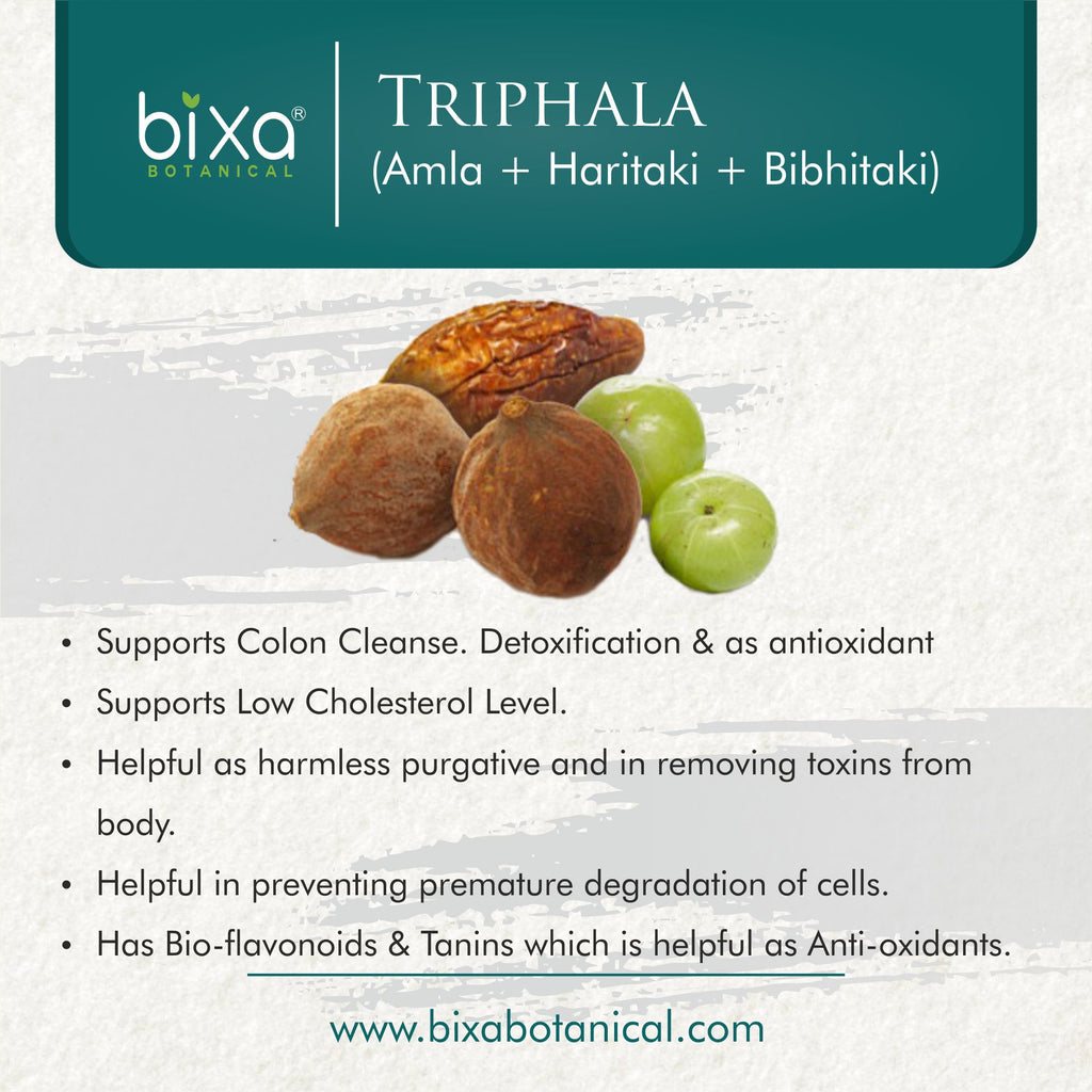 Triphala is an Ayurvedic traditional generic medicine that is popular as rasayana or the rejuvenator. Triphala is the combination of three wonderful herbs/ myrobalans - Emblica officinalis, Terminalia chebula and Terminalia belerica in equal quantity. Triphala Powder is used to balance the doshas (the elements of body and mind), especially it pacifies vitiated Kapha/pitta and supports enhancement in the process of digestion and elimination of toxins. Triphala Powder supports laxative and carminative action, which helps to relieve constipation, flatulence, gas, and abdominal distension.
