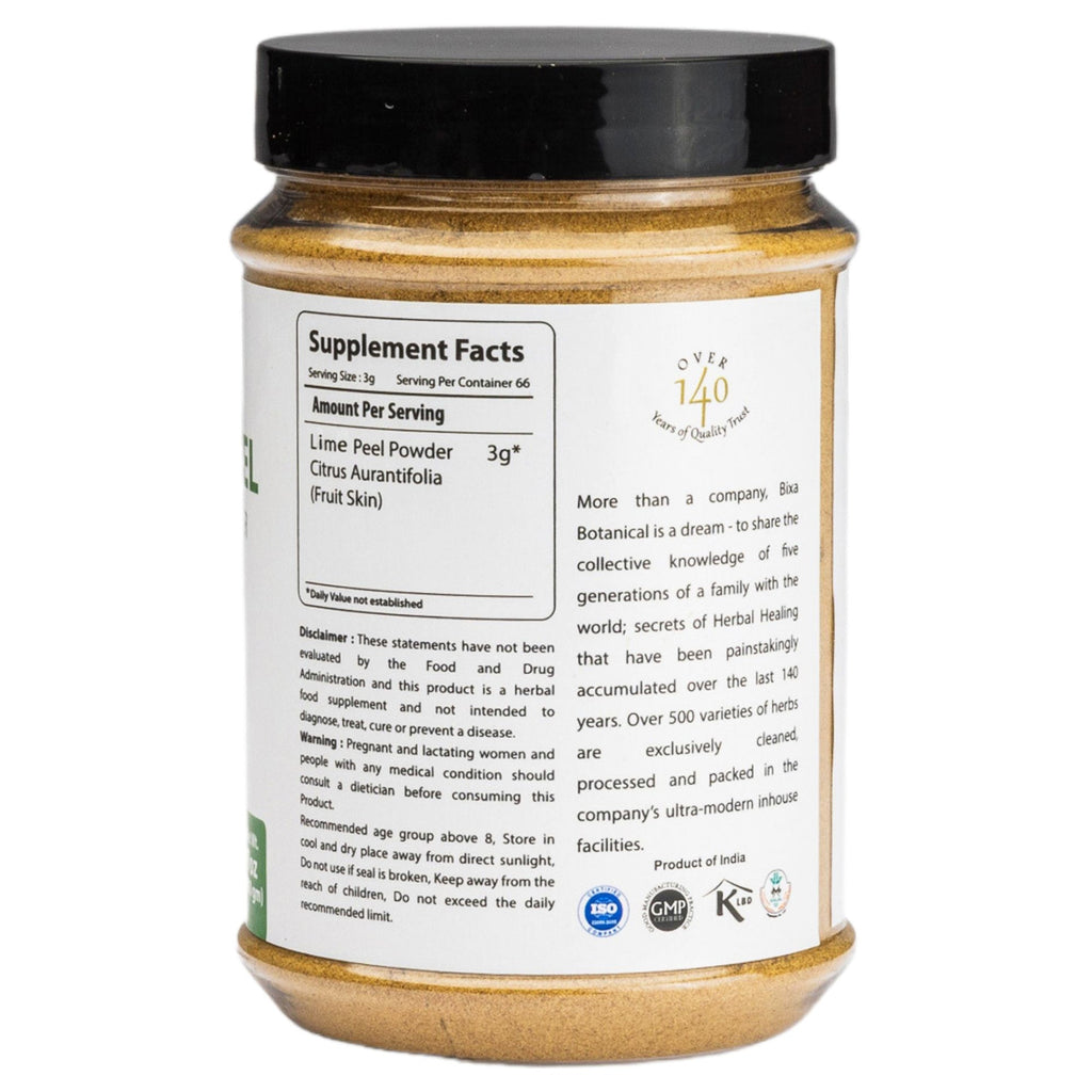 Lime peel Powder is derived from drying fruit rind of Citrus Limonum plant and crushing it. lime peel Powder contains Volatile oil and is used externally from ages. Internally lime peel Powder taken in small quantity approx ½ tsp may be helpful as aromatic, stomachic & carminative when taken with herbal teas, smoothies etc. lime peel Powder can also be used with other spices to improve digestion power. Scientific study has shown presence of Vitamin C, Citric acid & volatile oil in lime peel Powder . Externally it may be used with other ingredients to improve skin texture & quality. lime peel and honey mask makes a perfect scrub for the face, hands and feet for promoting removal of dead tissues. One can make a coarse paste with lime peel Powder , wheat Powder and honey by adding small amount of milk. Rub the paste on the body in circular movements and wash after some time. This mask may help in removing stress & strain on the skin and support rejuvenation of the skin. lime peel Powder and milk Or papaya fruit juice forms a face pack paste, apply/smear it on the face & leave it to dry. Then clean it with fresh water. This will help in making the skin supple and moisturized. The high content of Vitamin C in lime will help to lighten the skin tone and remove dark spots caused by skin tan. Yogurt and lime peel face pack may be used for removal of suntan and dark spots. This pack will help to lighten the tone of the skin and reduce dark spots from the face. lime peel Powder also helps to remove stains on teeth when rubbed with 1-2 pinch of salt in morning and rinsing with plain water.