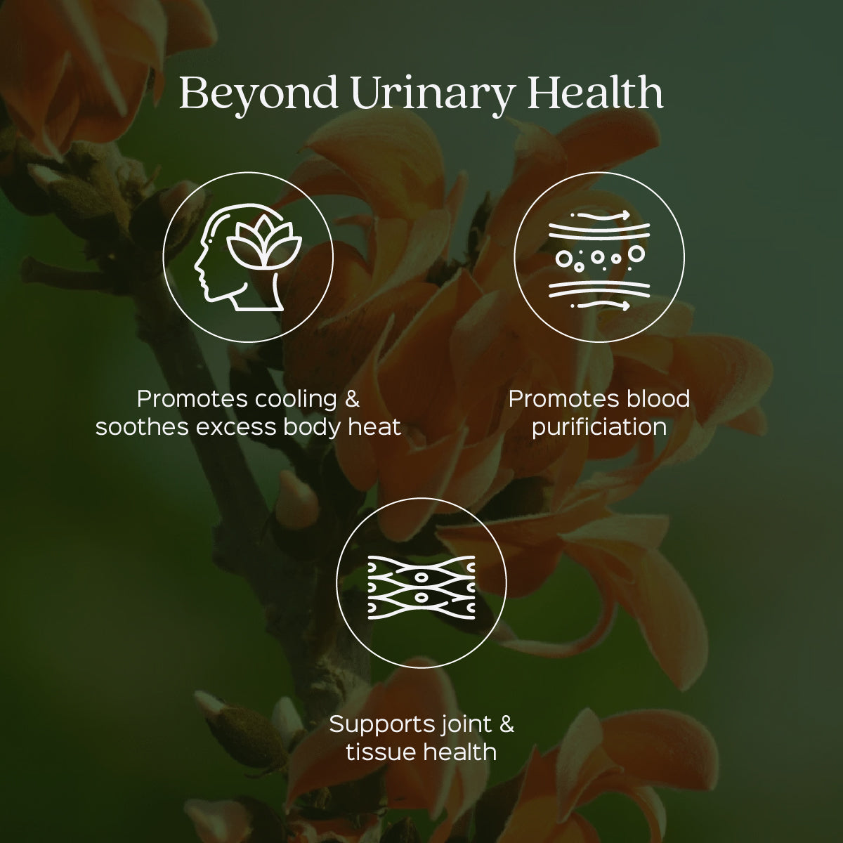 In Ayurveda, Palash is described as bitter, astringent, cooling, and cleansing — known to pacify aggravated Pitta and Kapha while promoting purification of the blood, skin, and urinary system. It is especially valued for its ability to soothe inflammation, ease urinary discomfort, cool excess body heat, and detoxify tissues.