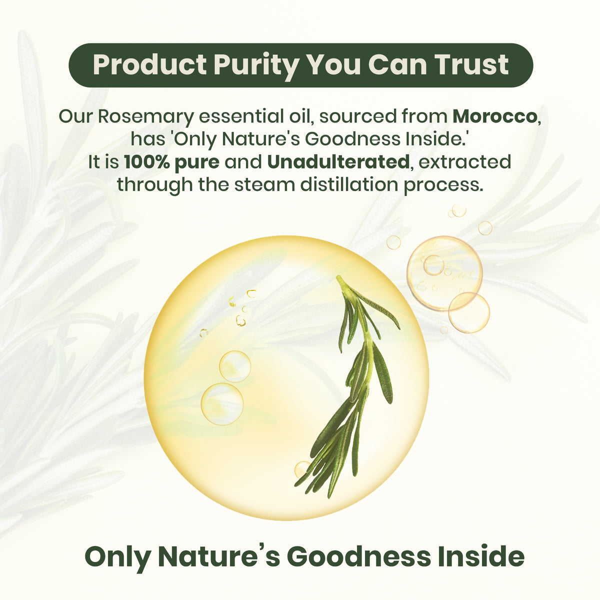Our 100% Pure, Unadulterated Rosemary Essential Oil is steam-distilled from high-quality rosemary leaves sourced from Morocco, ensuring maximum potency. This vegan oil is free from parabens, sulfates, preservatives, and harmful chemicals, guaranteeing top quality for your hair care.